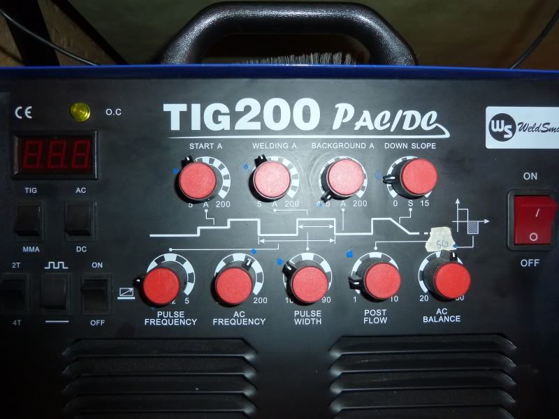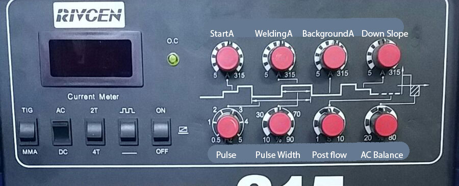 Start Amps - Ramping upwards, allows for a really low amperage startup or a hot one. (not used with pedal) Welding Amps - peak amps Background Amps -Background current is the low current of the pulse. Down Amps -allows the current to decrease at whatever rate you set on the knob so that you wont leave a defect like a fish eye or crater crack (not used with pedal) Pulse - pps or pulses per second…, 'Hz' how fast the pulses happen per second., you might think that once you get above 30 pps it would be like no pulse at all…you would be wrong. Higher pulse rates really focus the arc. Pulse Width - This is the percentage of time the current stays on the high side of the pulse. For starters, I recommend 30-50 percent...if you go much lower than 30, it just limits your heat too much and you wind up just giving it more foot pedal to compensate. Post Flow - the length of time the torch gas flows after the arc terminates. Ac Balance - Syncrowave technology gives you the ability to set balance control on range from 0 to 10, or maximum cleaning to maximum penetration - • 2t ---for using a switch on the torch handle…when you plug in the foot pedal or torch amperage control, most tig inverters are designed to bypass the 2t and 4t settings because the amperage control overrides all the upslope and downslope stuff. The 2t setting pretty much turns the torch switch into a 2 position switch. Press the switch , you get and arc. Let off the switch, arc goes out. • 4t—the 4t position is most always used in conjuction with upslope and downslope settings…something like this… o press the button and you get an arc. o Let off the button and the arc upslopes to whatever the main aperage is set to o Weld o Press the button and arc downslopes to lower amperage o Let off the button and arc quits. o Some machines are different but this is the general principle of 4t operation