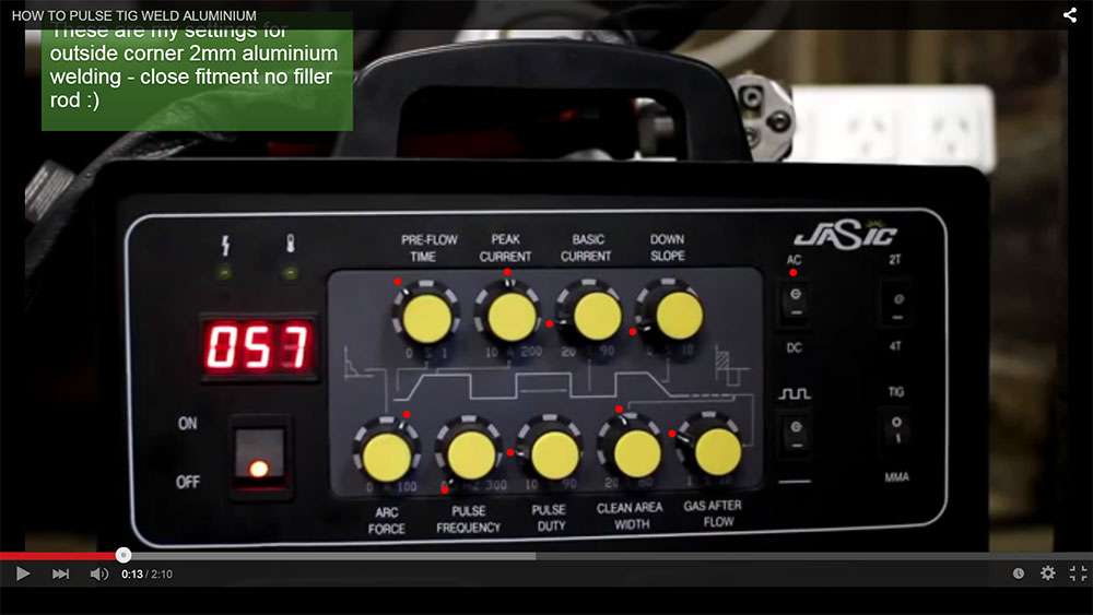 he uses : [One pulse/ second ,PeakA : 120amps , Background 30amps, 50% of time on peaks, can time filler with pulse] , This vid :