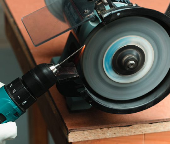 Cups should ideally be 4 to 6 times the size of the electrode The length of the taper on the tungsten tip should be two to three times the diameter of the tungsten. To safely hold tungsten electrodes for sharpening with a grinder, insert them into the chuck of a drill. Running the drill while sharpening the tungsten ensures a uniform point. Move the tungsten across the wheel to prevent grooves in the wheel edge.
