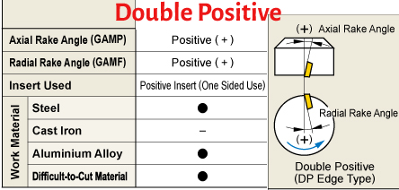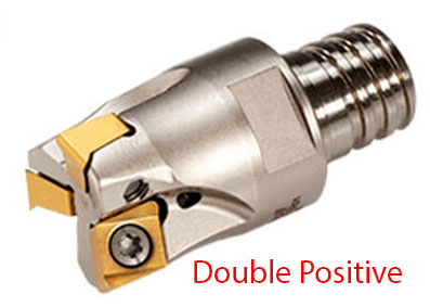 The positive axial rake lifts the chip and curls it away from the finished workpiece surface and toward the inside of the cutter body. The positive radial rake provides a sharper cutting edge and tends to pull the tool into the work (free cutting). Double positive cutters hold the inserts in a way that creates a positive rake angle both axially and radially, allowing for very free cutting and clean, quiet machining. It’s an arrangement that also minimizes work hardening of the surface, achieves excellent surface finish as well as generates very little cutting force. These geometries are good for machining non-ferrous materials, such as aluminum, copper and non-metallic materials, and even steels on smaller machines with limited power ratings. Care with the set-up is particularly important with these cutters as they are more fragile (leading to cutting edge chippage) and can lift the workpiece from the table. Overall Advantages Smooth cutting Good chip removal Good surface smoothness Overall Disadvantages Cutting edge strength Unfavorable entry contact Draws workpiece away from the machine table