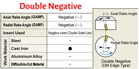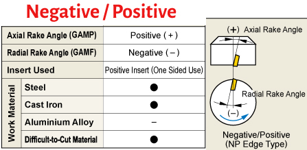 Called in the industry shear-angle cutter. Often used in rough and finishing milling of tougher grade of aluminium and other non ferrous metals and for free machining of cast iron steel, steel, stainless and most high temp aloys which are milled difficulty using doubke negative Positive/negative cutters have an orientation that uses a combination of a positive axial rake angle and a negative radial rake angle. These cutters are the most popular because they offer some of the free cutting benefits of a double positive cutter and some of the strength of a double negative cutter. The positive axial rake lifts the chips, while the negative radial rake directs them outward. These actions, when paired with a high lead angle, help reduce or eliminate chip flow obstructions. Overall Advantages Good chip removal Favorable cutting forces Wide range of applications